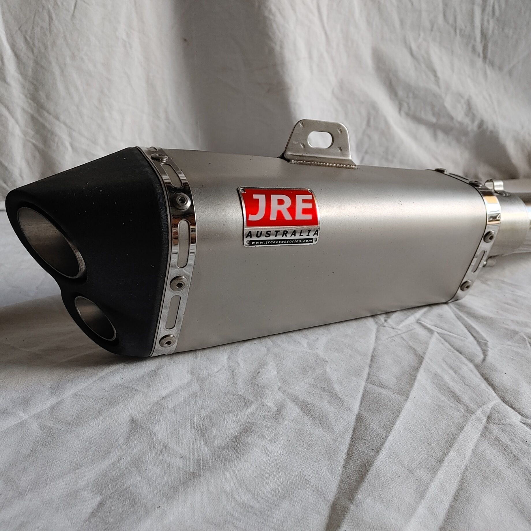 Muffler,is flat grey finish; features a straight through race core design dual outlet; excellent note with and light weight 3.9 kilos;